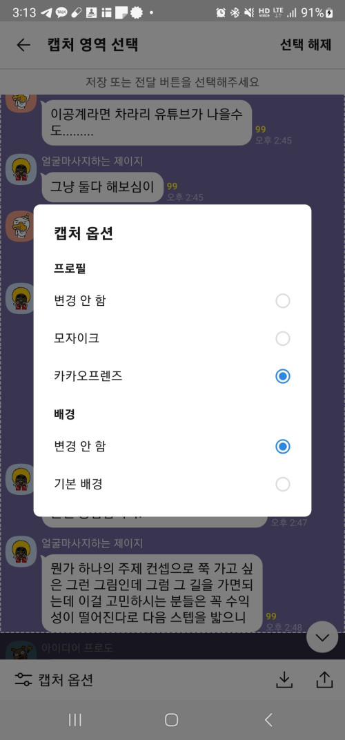 본인이 캡쳐할 대화를 선택하고 캡쳐 옵션에서 카카오 프렌즈로 변경합니다. 모자이크로 변경해도 큰 상관은 없습니다.
