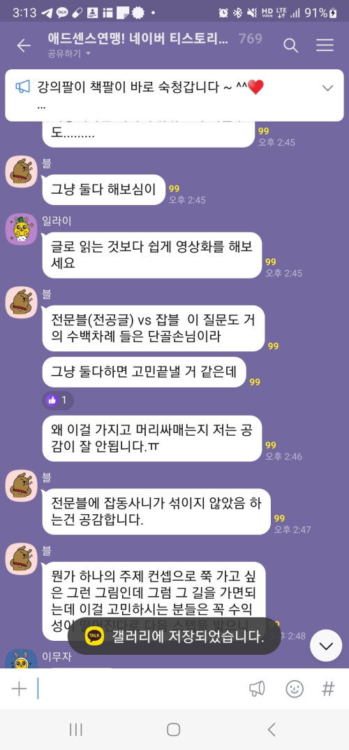이후 다운받기 버튼을 누르게 되면 '갤러리에 저장되었습니다' 라는 안내와 함께 채팅 내역이 저장되는데 이름이 이전과는 다르게 다른 이름으로 변경되어 있으며 프로필도 다르게 변경된 것을 볼 수 있습니다. 휴대폰 자체 캡쳐와는 조금 다르게 채팅을 치는 부분과 상단 시계화면 등 안보이는 부분이 일부 생기기도 합니다.