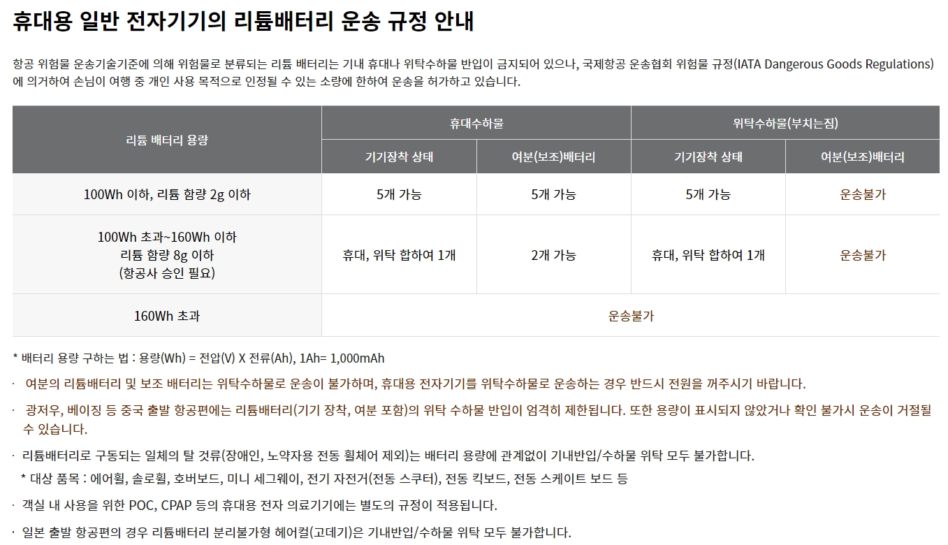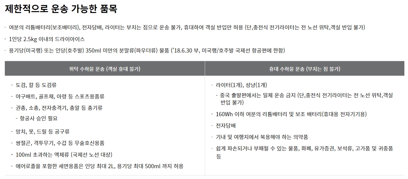 이 내용은 아시아나 항공 운송제한물품 규정 일부를 참고하였습니다.