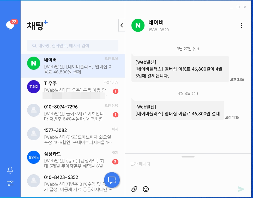 본인이 컴퓨터 앞에 앉아서 근무를 하는 사무직이거나 집에 있는 컴퓨터(노트북)에 채팅플러스 PC버전을 설치해놓았다면 메세지를 놓치지 않고 볼 수 있습니다. 마치 카카오톡 메세지가 왔을때 확인할 수 있는것과 동일하다고 보시면 되며 메세지를 보낼때 역시 채팅을 하듯이 보내면 되기 때문에 편리함이 한층 증가합니다. 게다가 나름 과거버전인 Windows와 연결을 통해 휴대폰을 컴퓨터와 연결했던 적이 있다면 채팅플러스는 카카오톡과 동일하게 휴대폰이 꺼져있더라도 그에 상관없이 메세지를 주고 받는 것이 가능합니다.